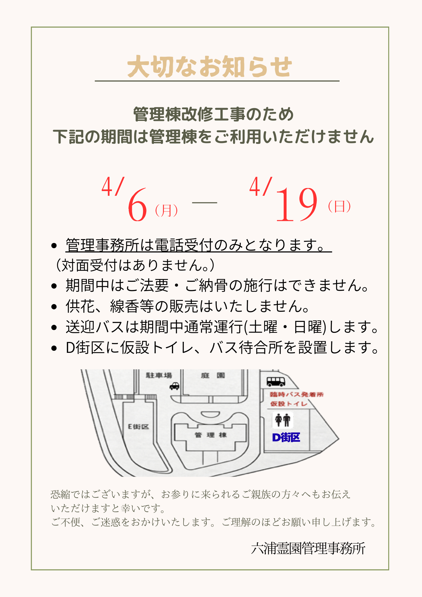また、期間中管理事務所は電話対応のみとなります。供花等の販売も休止しますのでご注意ください。